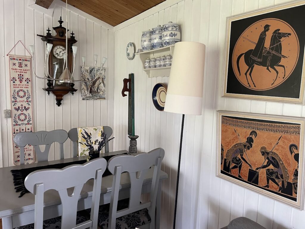 Indvendigt stod træet som natur, men nu er der malet hvidt indvendigt. Gardinerne er de originale. Det samme er nogle af billederne på væggen, der har motiver fra den græske mytologi. Det bekræfter lektor Kofods interesse i dette.